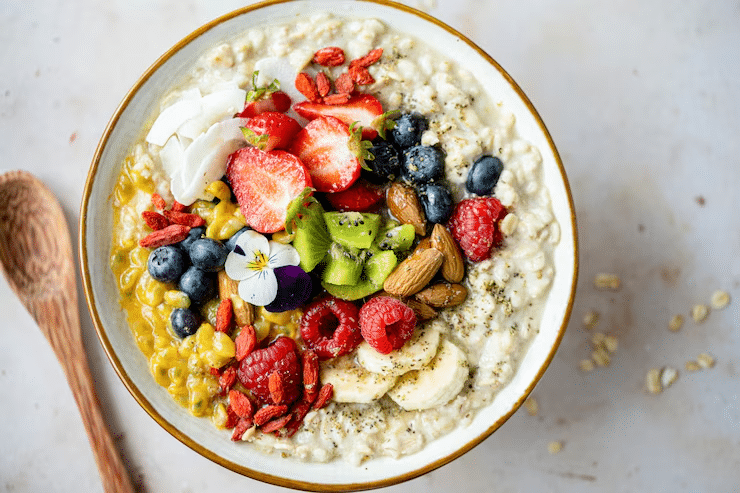 Add 50–75g of soft tofu or paneer cubes to your oatmeal. They blend well and make your breakfast high in plant protein — especially great for vegetarians.